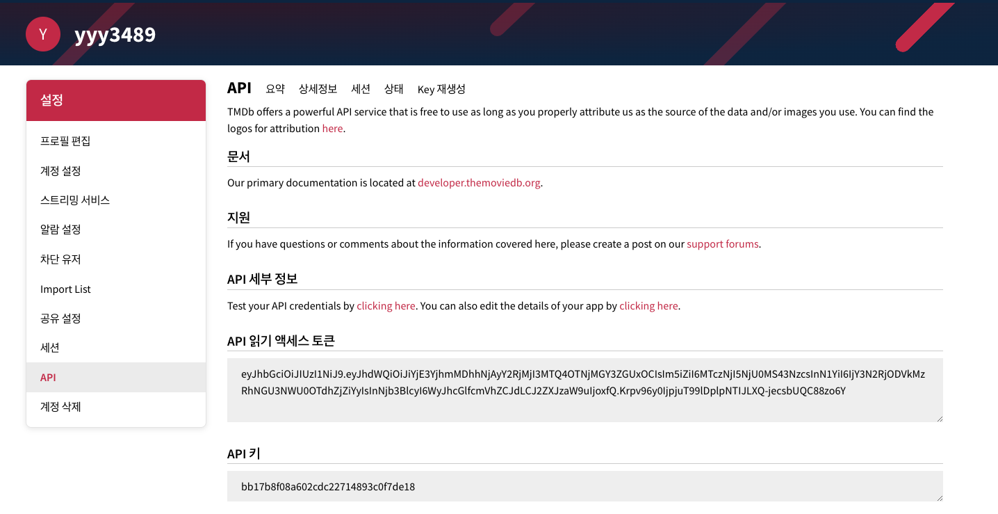 TMDB 사이트를 접속한다음 -> 회원가입을 진행과 동시에 api 키값을 받고 로그인 하고 프로필 설정 들어가서 왼쪽 목록에 api를